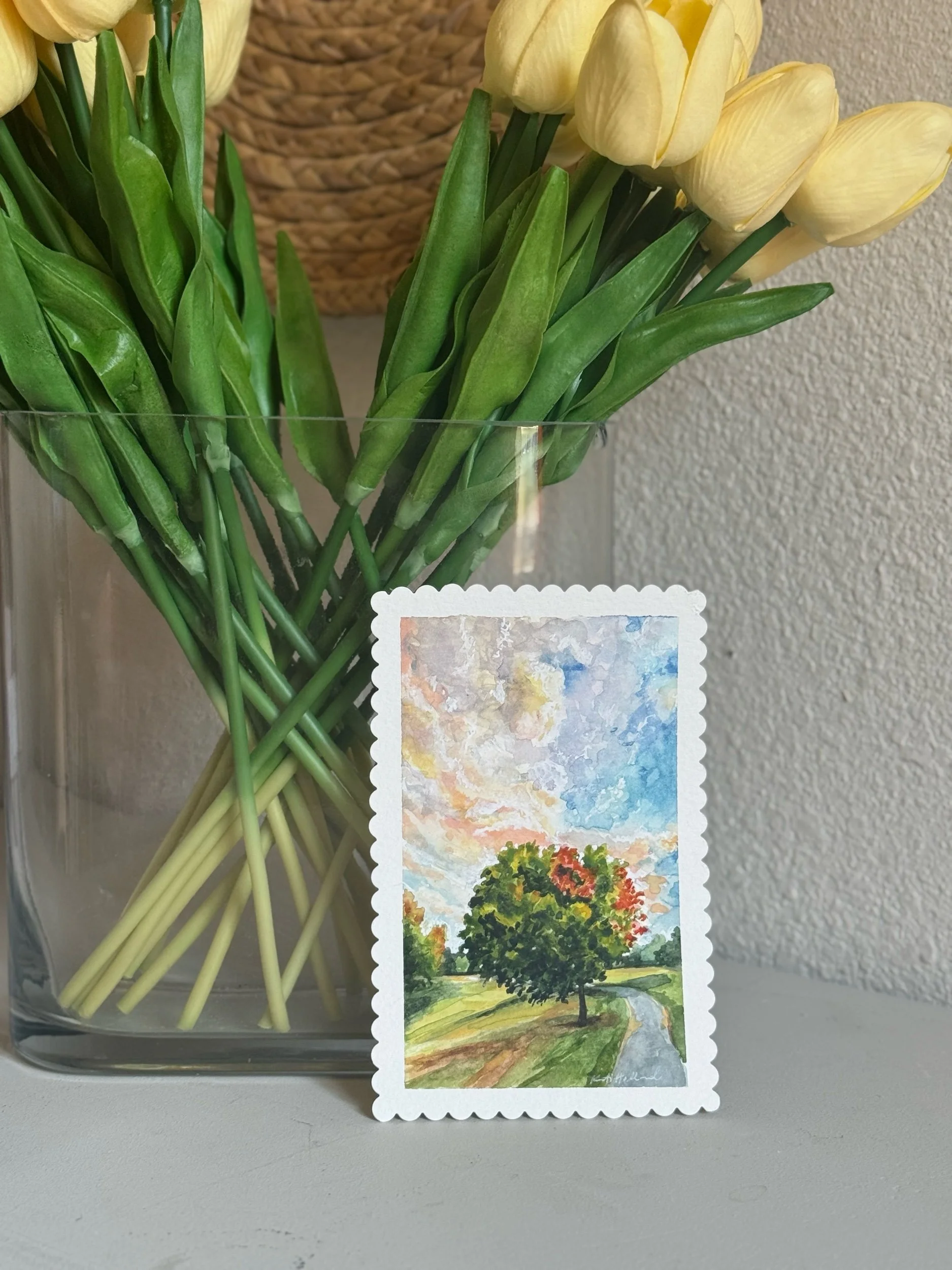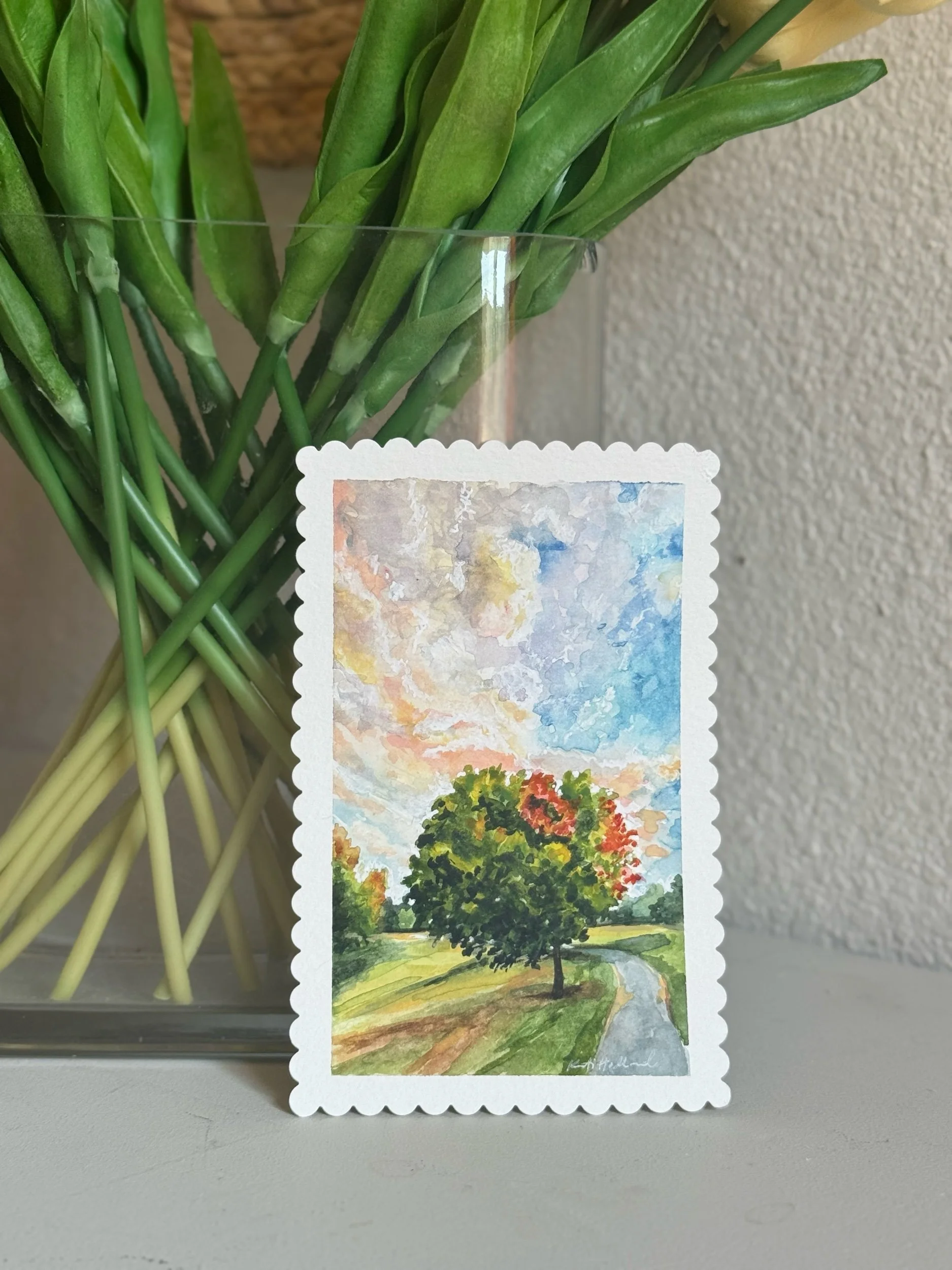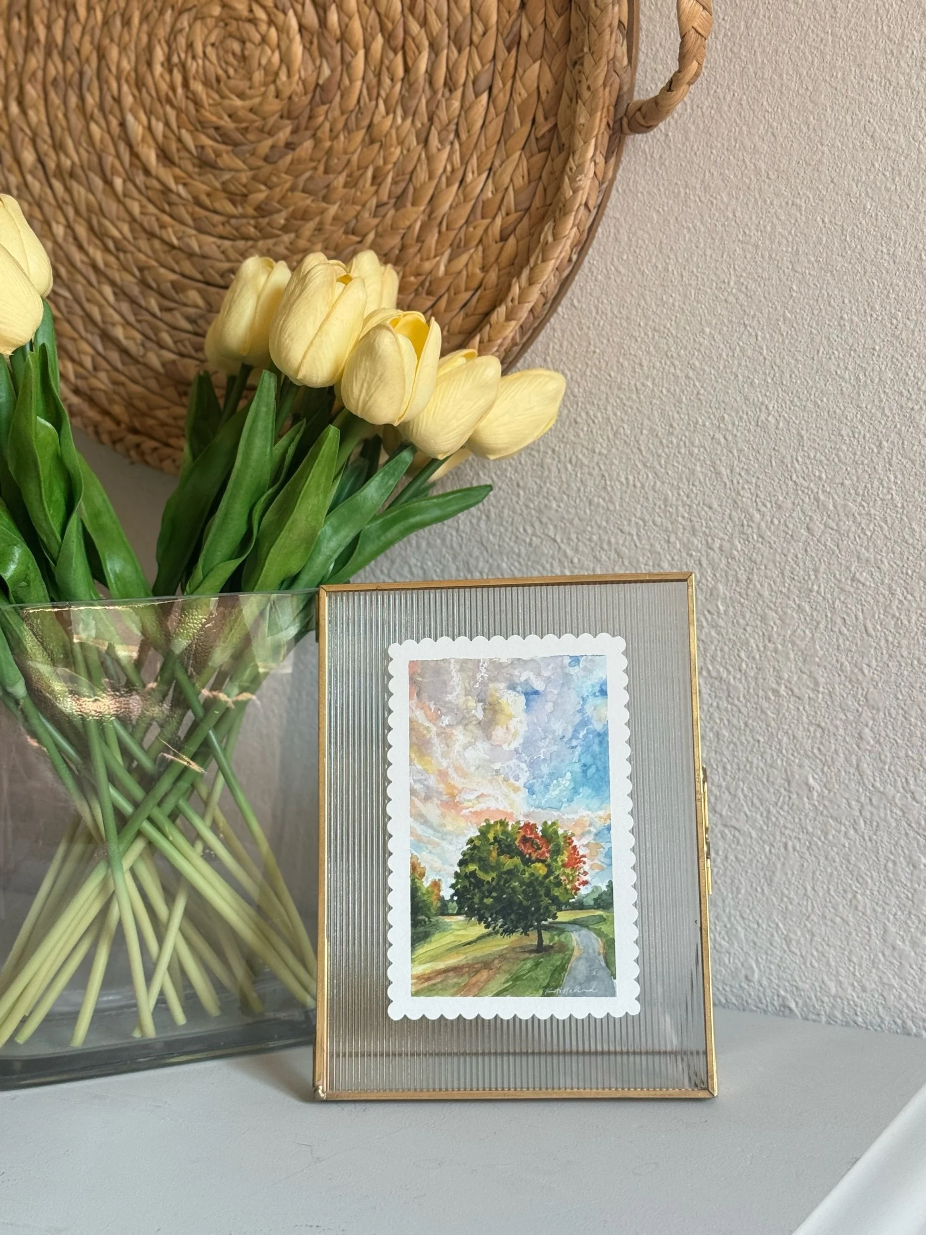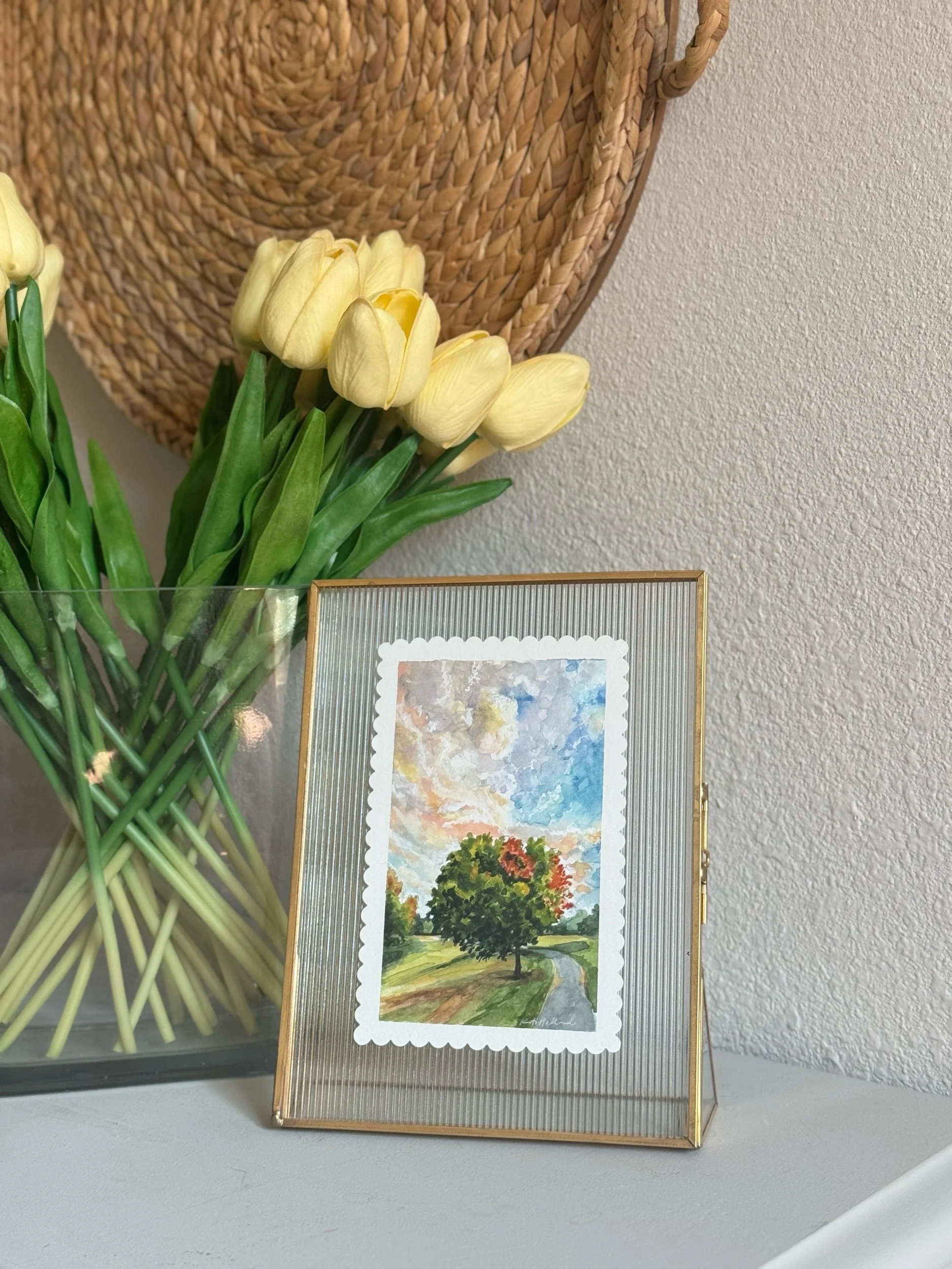 Measuring approximately at 4x6 inches with scalloped edges. It comes framed in the gold rimmed, standing glass frame.